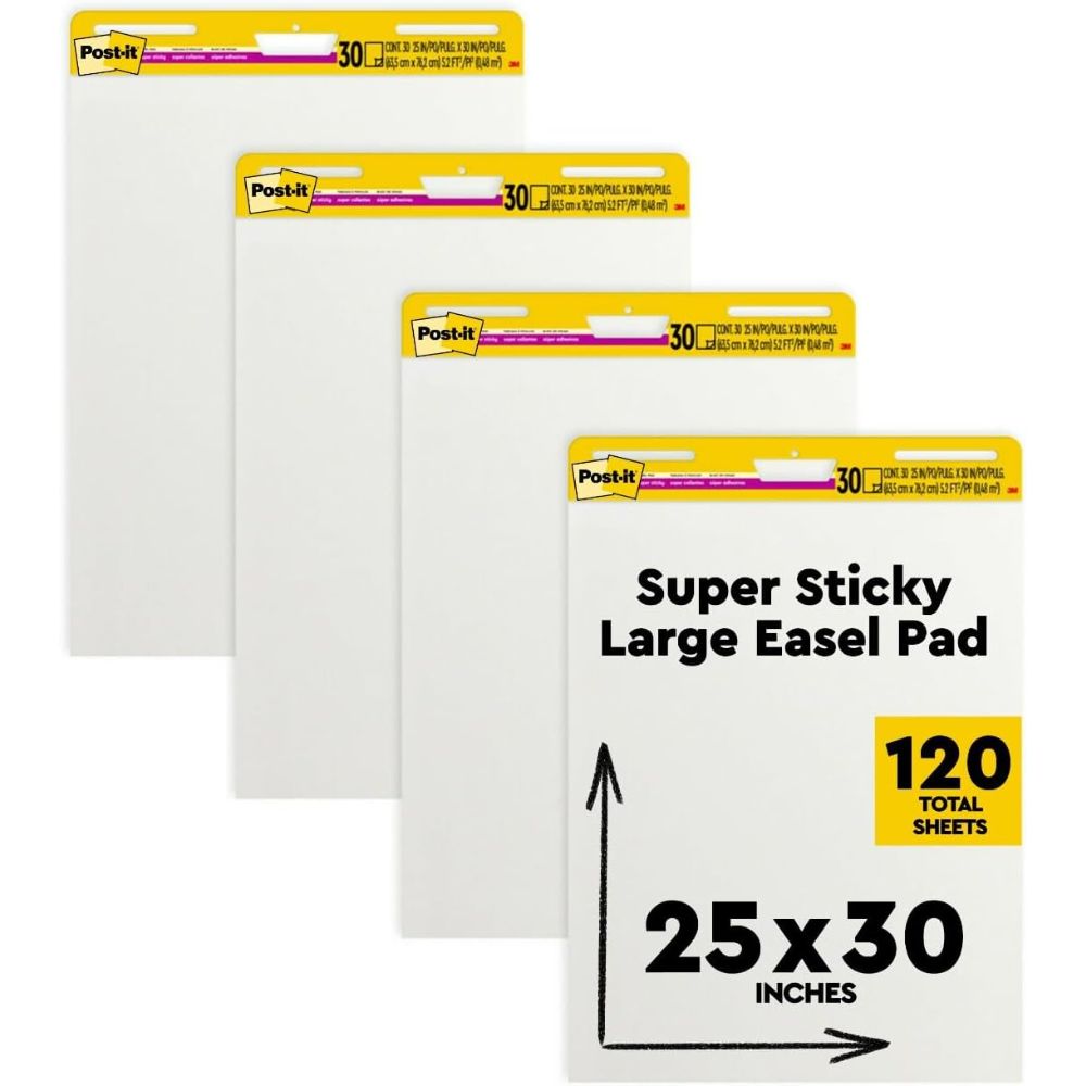 3M Post-it Easel Pads – Super Sticky Self-Stick, 25 in x 30 in, White, 30 Sheets per Pad, 6 Pads per Carton