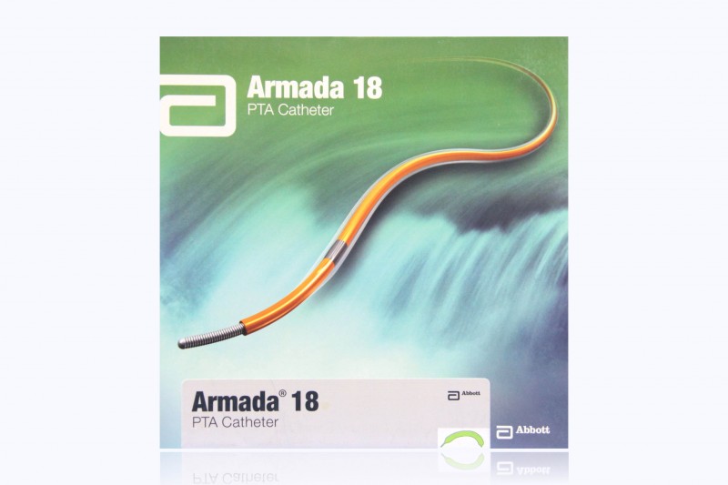 The Abbott Armada 18 PTA Catheter is a peripheral balloon dilation device designed for percutaneous transluminal angioplasty (PTA) in the treatment of stenotic or occluded vessels, particularly in larger-diameter arteries such as the iliac and femoral. This model features a 6.0 mm diameter and 150 mm working length, making it suitable for extended lesions requiring uniform dilatation over a longer segment. The semi-compliant balloon provides controlled expansion with high rated burst pressure for reliable performance in challenging vascular anatomy.