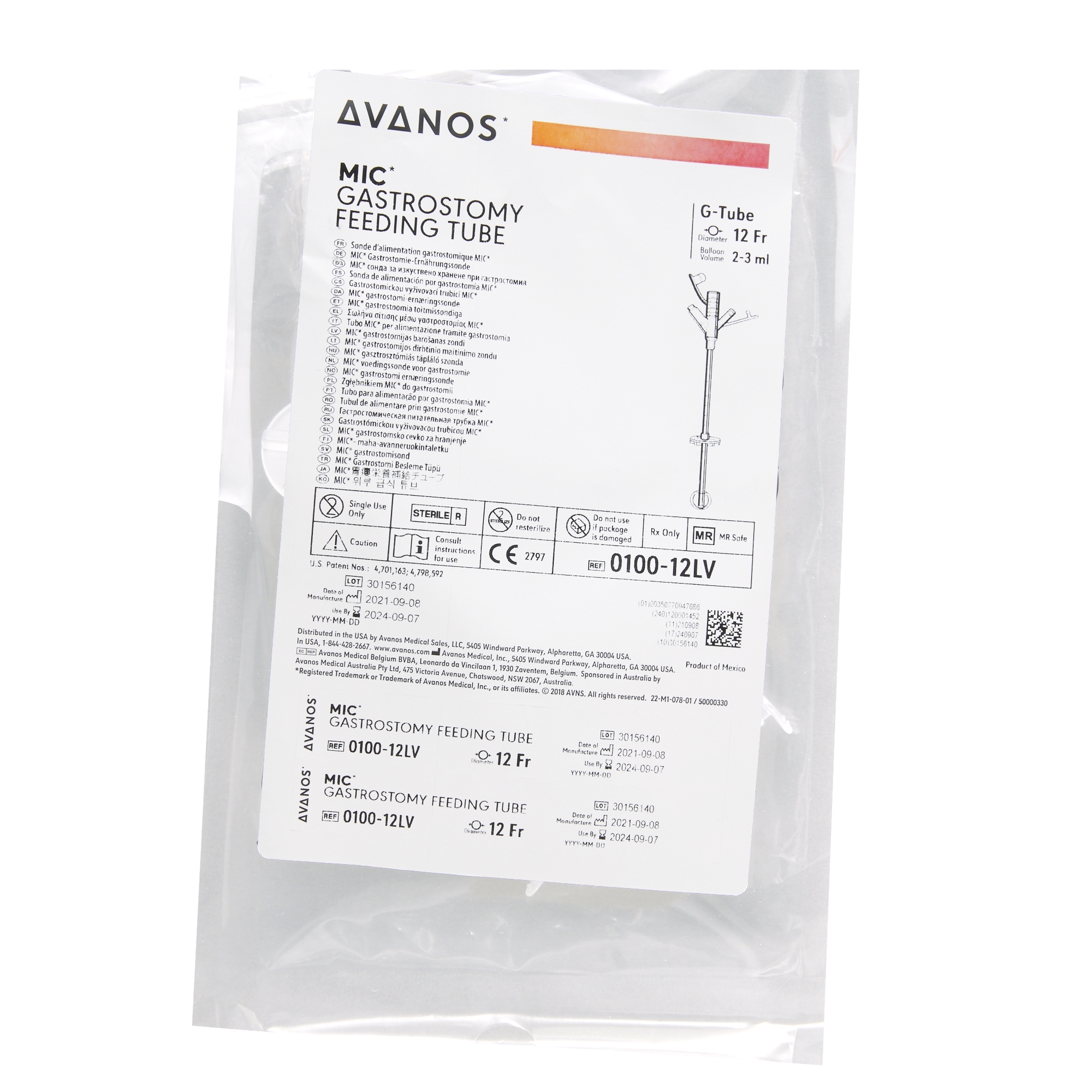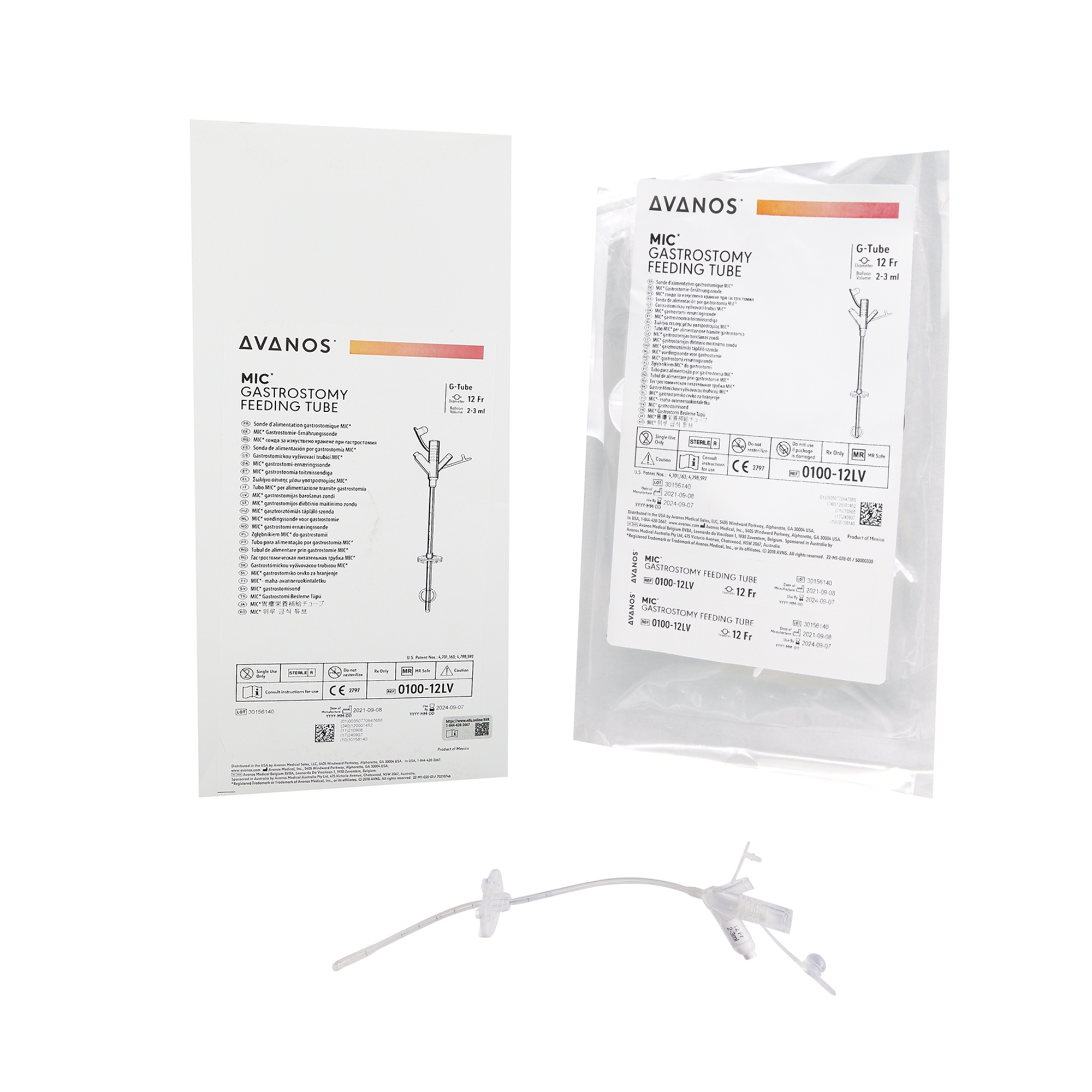 The Avanos Medical 0100-12LV is a sterile, silicone MIC® gastrostomy feeding tube, 12Fr, with silicone internal retention balloon (3-5mL), universal feeding port, medication port, and radiopaque stripe.
