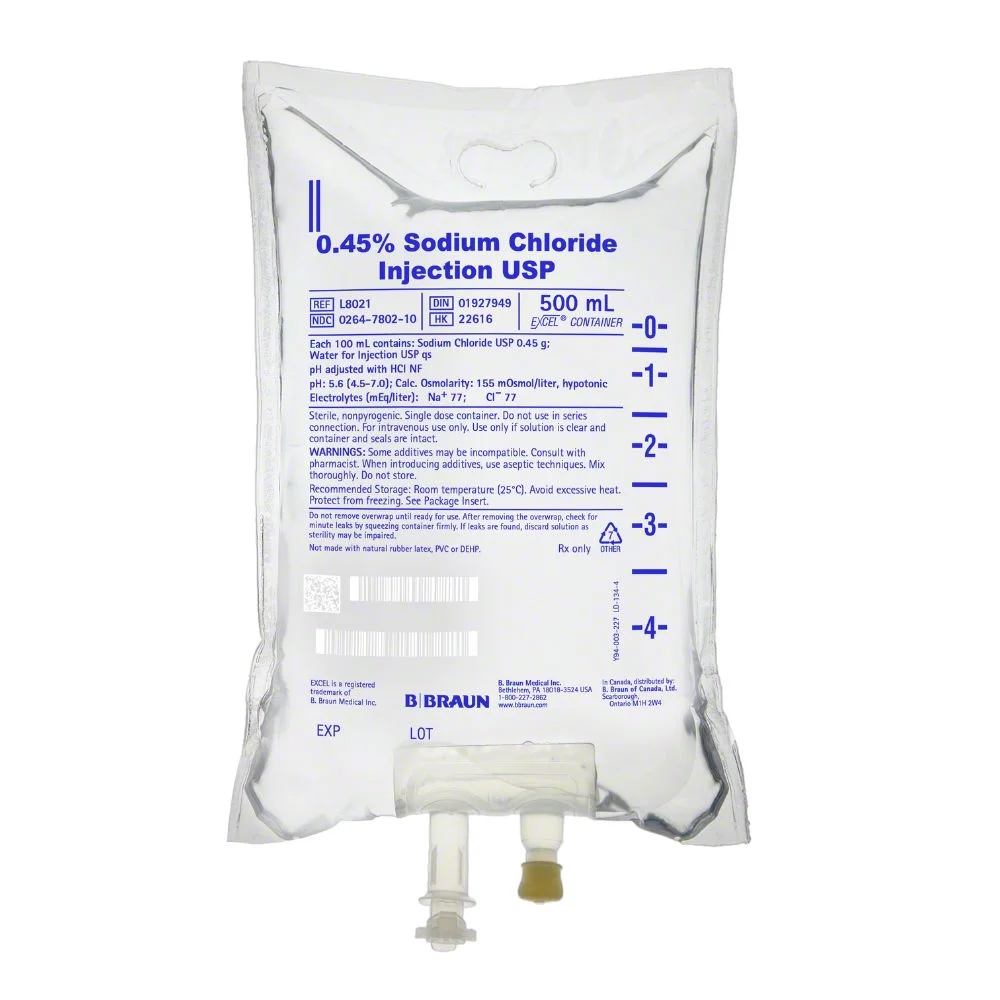 B. Braun 0.45% Sodium Chloride Injection USP is a sterile isotonic to hypotonic solution designed for intravenous hydration. It provides a balanced source of sodium and chloride ions with a lower sodium concentration than normal saline making it suitable for patients requiring fluid replacement without excessive sodium load. Primarily used to assess kidney function by supporting urine output with minimal solute burden it is also indicated in the management of hyperosmolar diabetes when dextrose-containing solutions are not appropriate. This solution delivers more water relative to salt aiding in the correction of fluid deficits while helping maintain electrolyte balance. Packaged in a 500 mL flexible container that is ready to use with standard IV administration sets. Manufactured under strict quality standards to ensure safety efficacy and compatibility with clinical workflows.