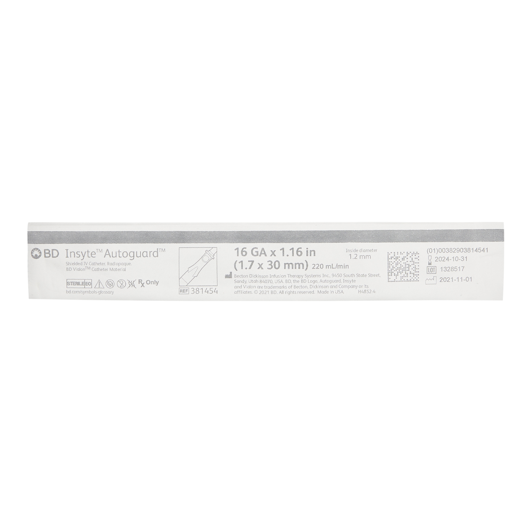 The BD 381454 is a 16G x 1.16″ gray Insyte™ Autoguard™ peripheral IV catheter with push-button safety and BD Vialon™ material, designed to enhance patient safety and improve clinical outcomes.