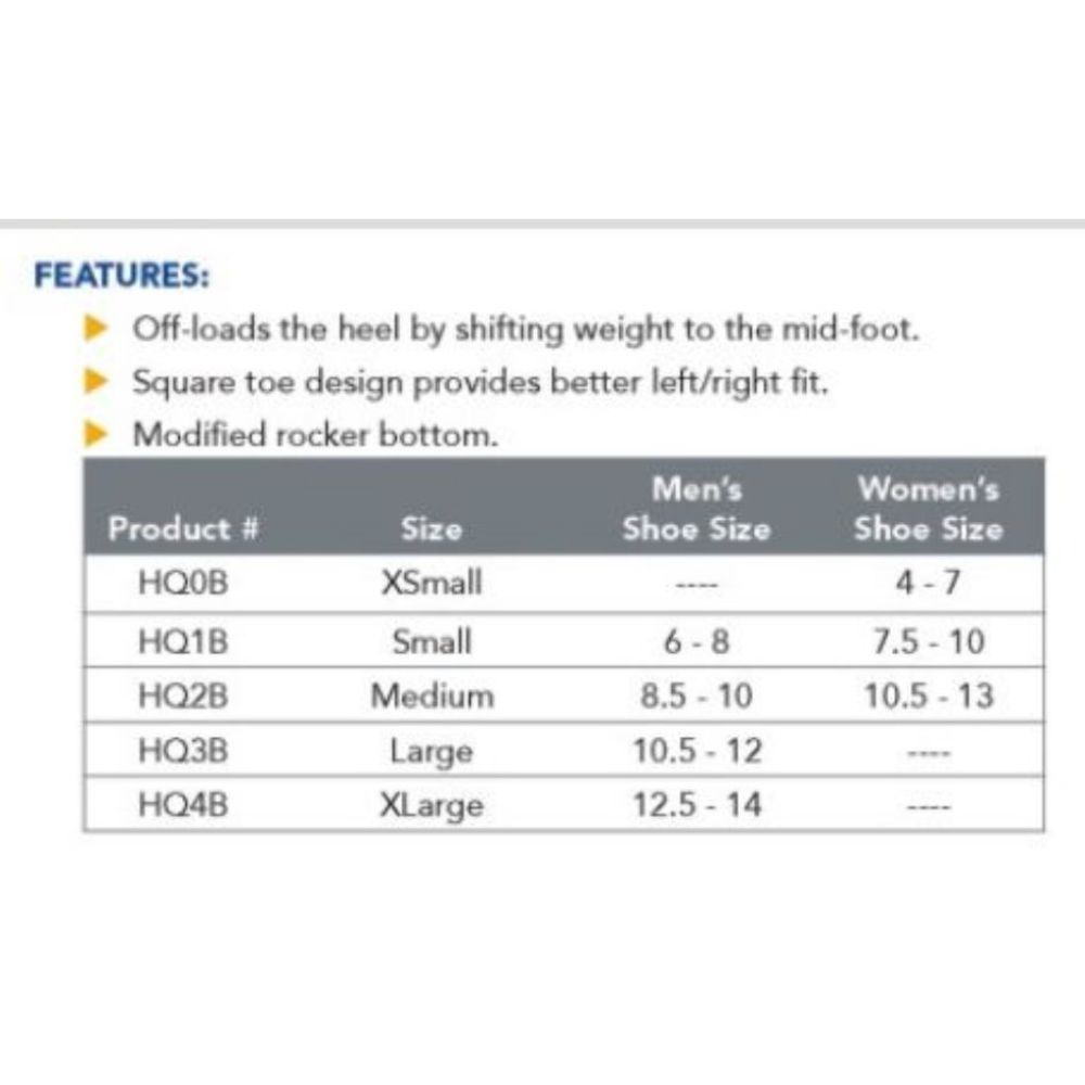 The DARCO HQ2B is a single (1) HeelWedge healing shoe in medium size and black color. This patented design is clinically proven to significantly reduce weight-bearing pressure on the heel, shifting it to the mid and forefoot to promote healing of plantar fasciitis, ulcerations, infections, trauma, and following surgery on the soft tissue or bony structure of the heel.
