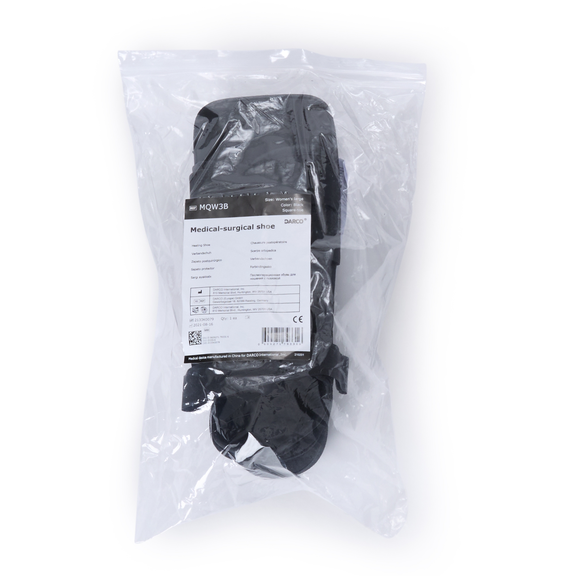 DARCO MQW3B refers to the +SHOE POST-OP designed for females in a large (LG) size and black color. This is the MedSurg™ post-operative shoe for women. It is sold individually (1/EA), with 12 units per box (12/BX) and 36 units per case (36/CA). This shoe features a rocker sole that reduces plantar pressure on the forefoot and heel by over 25%. Metashank™ protection provides more rigid control under the metatarsal heads. An ankle strap secures the foot firmly in the sole, eliminating heel friction. It has a strapless forefoot closure for adjustability and a removable insole with ample padding that is fully customizable. This large size fits female shoe sizes 8-1/2 to 10. The shoe is made of rubber and vinyl materials and has a square toe design.