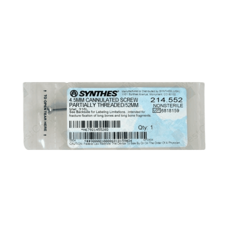 Depuy Synthes 214.552 4.5mm partial thread 52mm orthopedic screw for clinical applications.