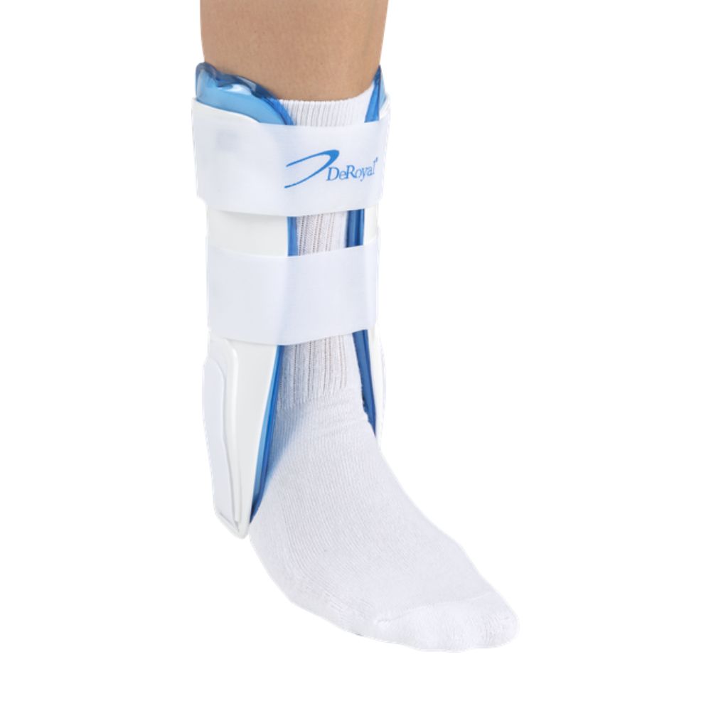 The DeRoyal AB2360-00 is an adult air ankle stirrup with adjustable air compression, rigid shells, and swivel straps, designed to provide support and stability to the ankle.