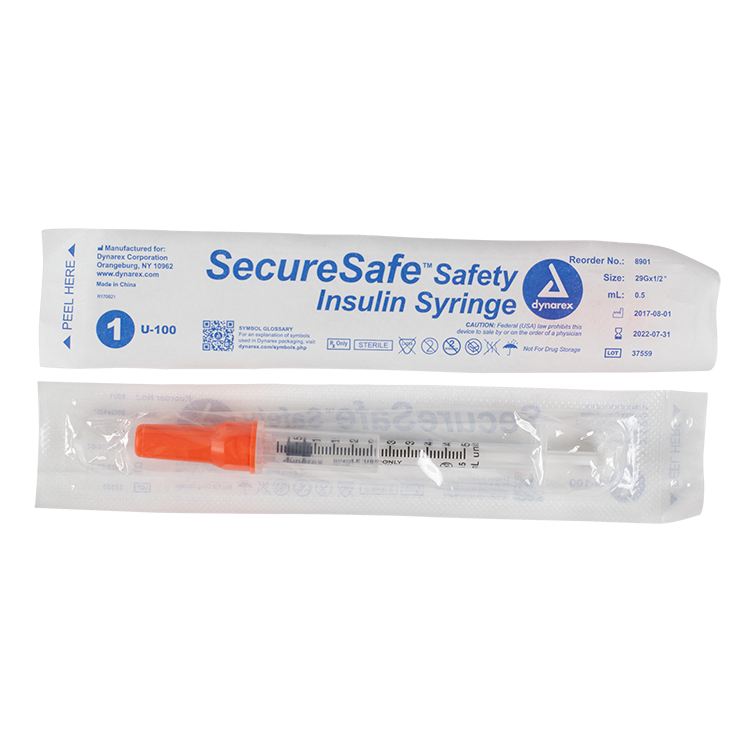 Dynarex 8901 SecureSafe Safety Insulin Syringe – 0.5 ml (New Mechanism), 29G, 1/2″ Needle, 5/100/cs
